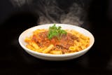 Topped with penne, mozzarella cheese, and tomato sauce.